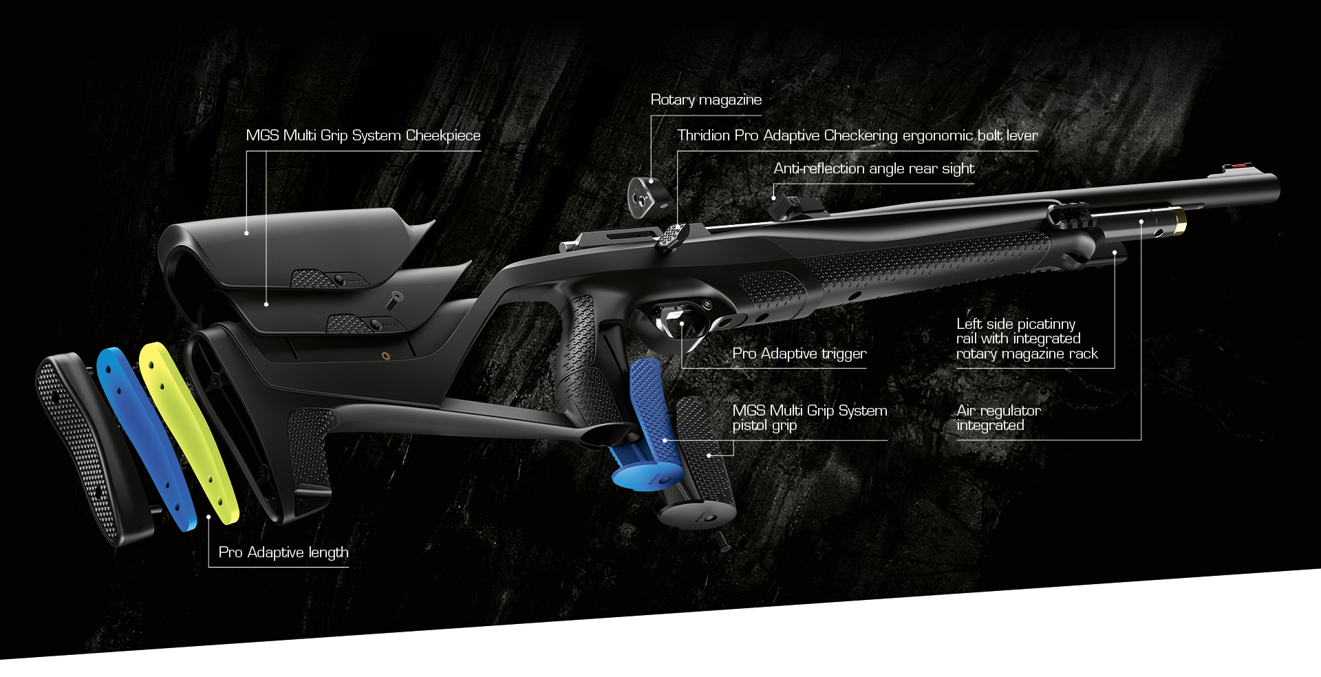 - Multi Grip System – võimaldab relva kohandada vastavalt laskja eelistustele