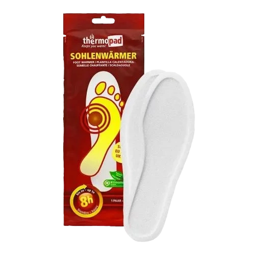 Thermopad Foot Warmer on õhuga aktiveeruv sisetald, mis hoiab jalad mõnusalt soojas kuni 8 tunni vältel. Ava pakk, aseta tald jalanõusse ja pane jalanõu jalga — juba mõne minuti pärast tunned soojust. Õhuke ja diskreetne disain sobib suusatajatele, talvejalutajatele, pikka aega külmas viibijatele ja kõigile, kellel hakkavad jalatallad kiiresti külmetama. Need sisetallad on universaalsed — sobivad saabastele, tossudele või muudele igapäevastele jalanõudele.